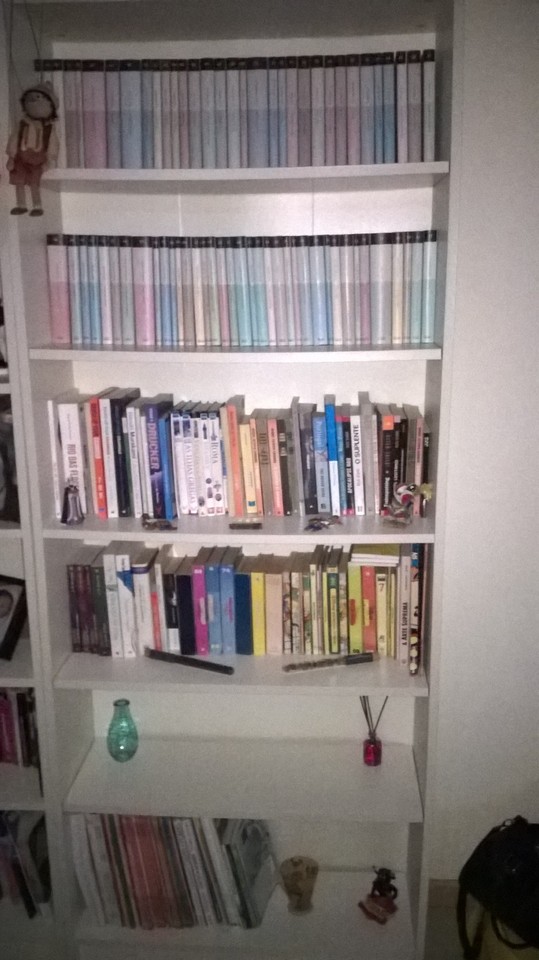 Esta é uma parte da biblioteca da minha irmã. Ao lado tinha outra estante igual com mais livros. São dela e do meu cunhado.